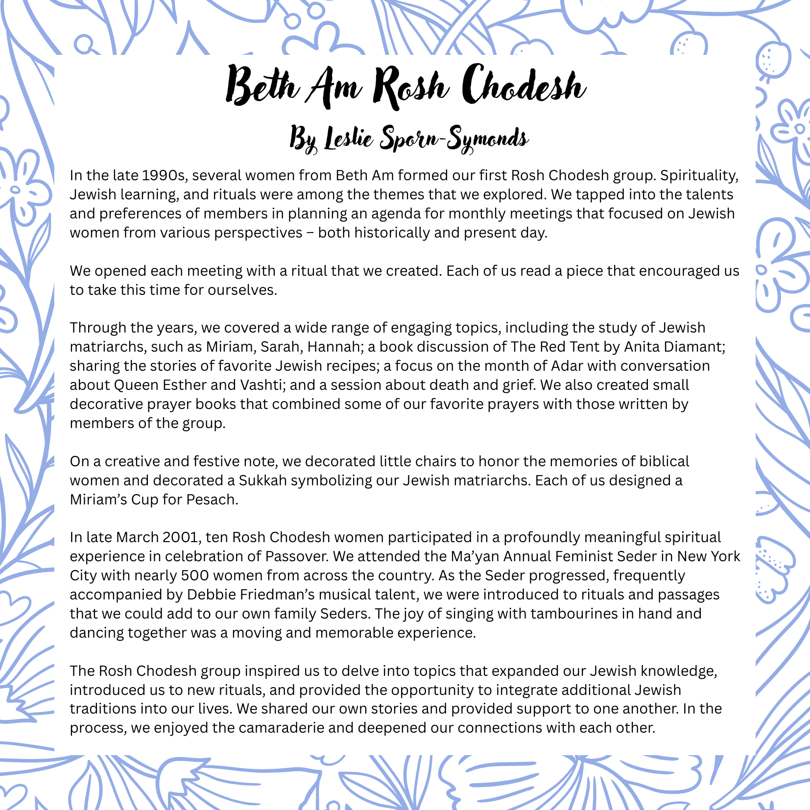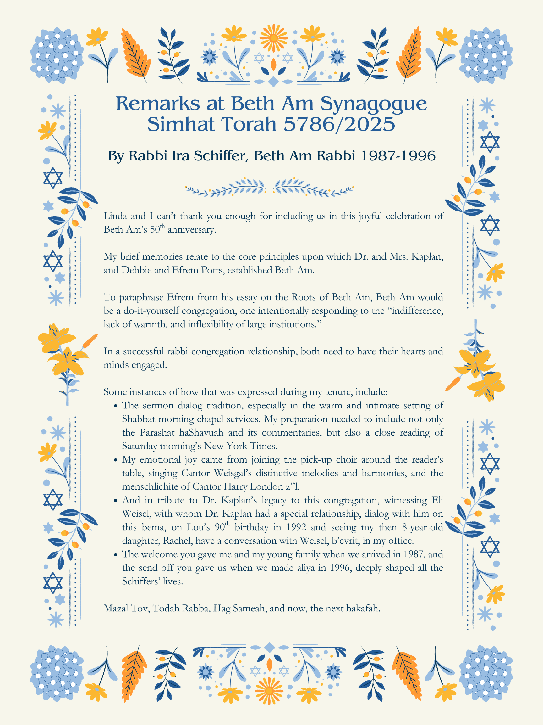 For five decades, Beth Am has grown through the voices and contributions of its members. This collection of stories, photos, and video highlights the diverse experiences that have woven our community together. May these reflections remind us of all we’ve built, and inspire what we will continue to build.