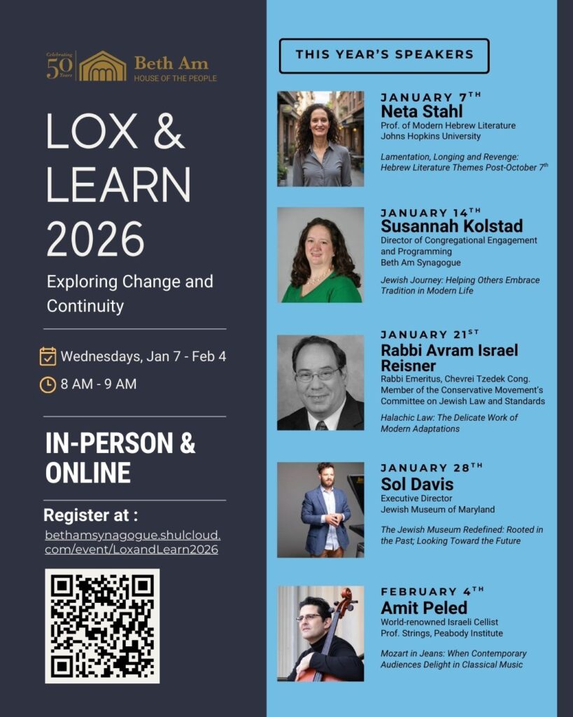 Join us for five consecutive Wednesday mornings beginning January 7th for bagels, lox, and a chance to learn together! Lox and Learn features a range of fascinating scholars and experts who share their knowledge with us. Each of this year’s speakers will present on “Exploring Change and Continuity.” We will meet at Beth Am Synagogue (a virtual option will be available). Please register for the zoom link.